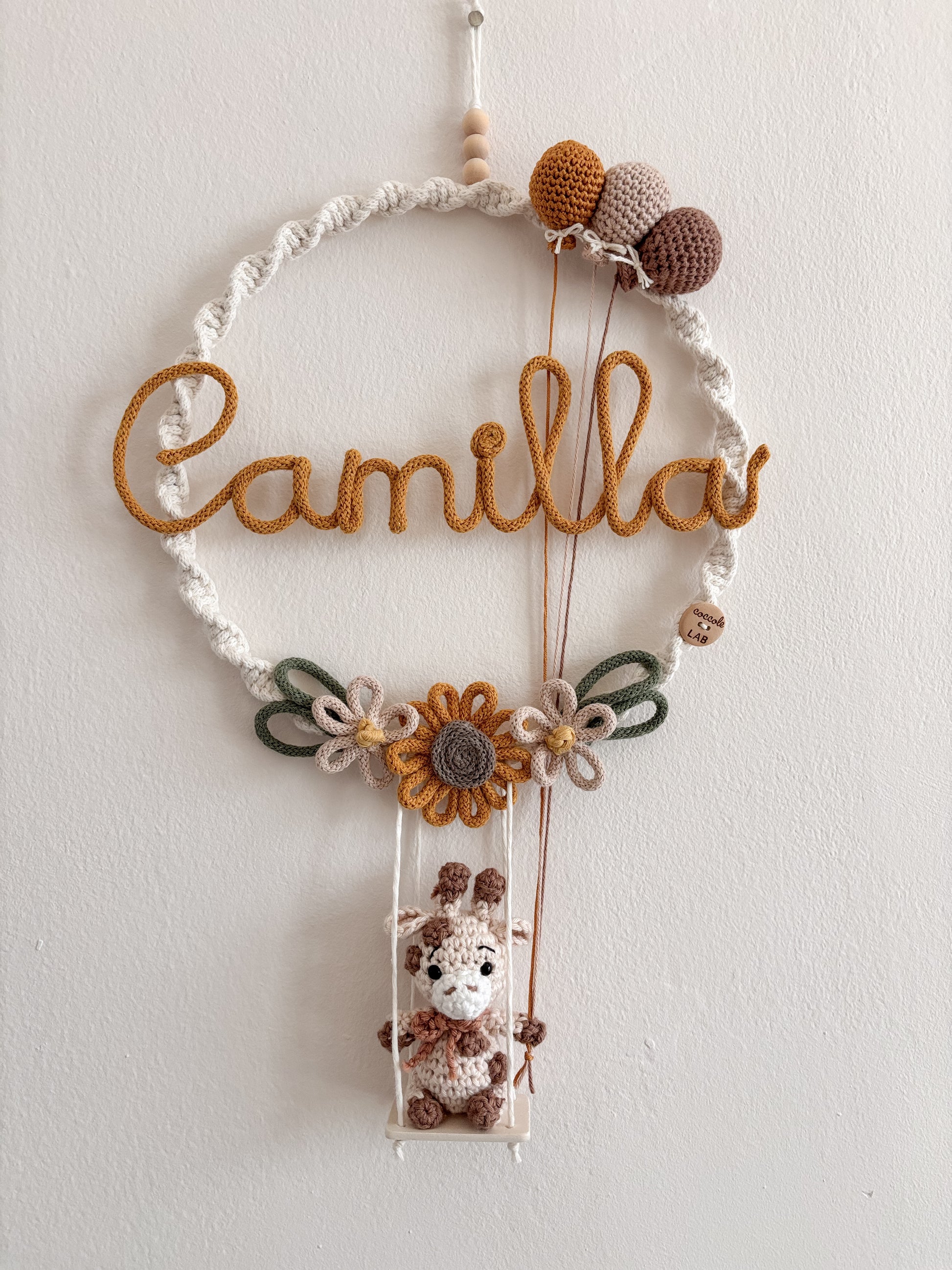 La ghirlanda nascita sogno di giraffina è realizzata a mano con cotone riciclato al 100% e certificato OEKO-TEX standard 100. E' composta da un cerchio rivestito in macramè, un dolce giraffina al centro, fiorellini e palloncini a completare la cornice.