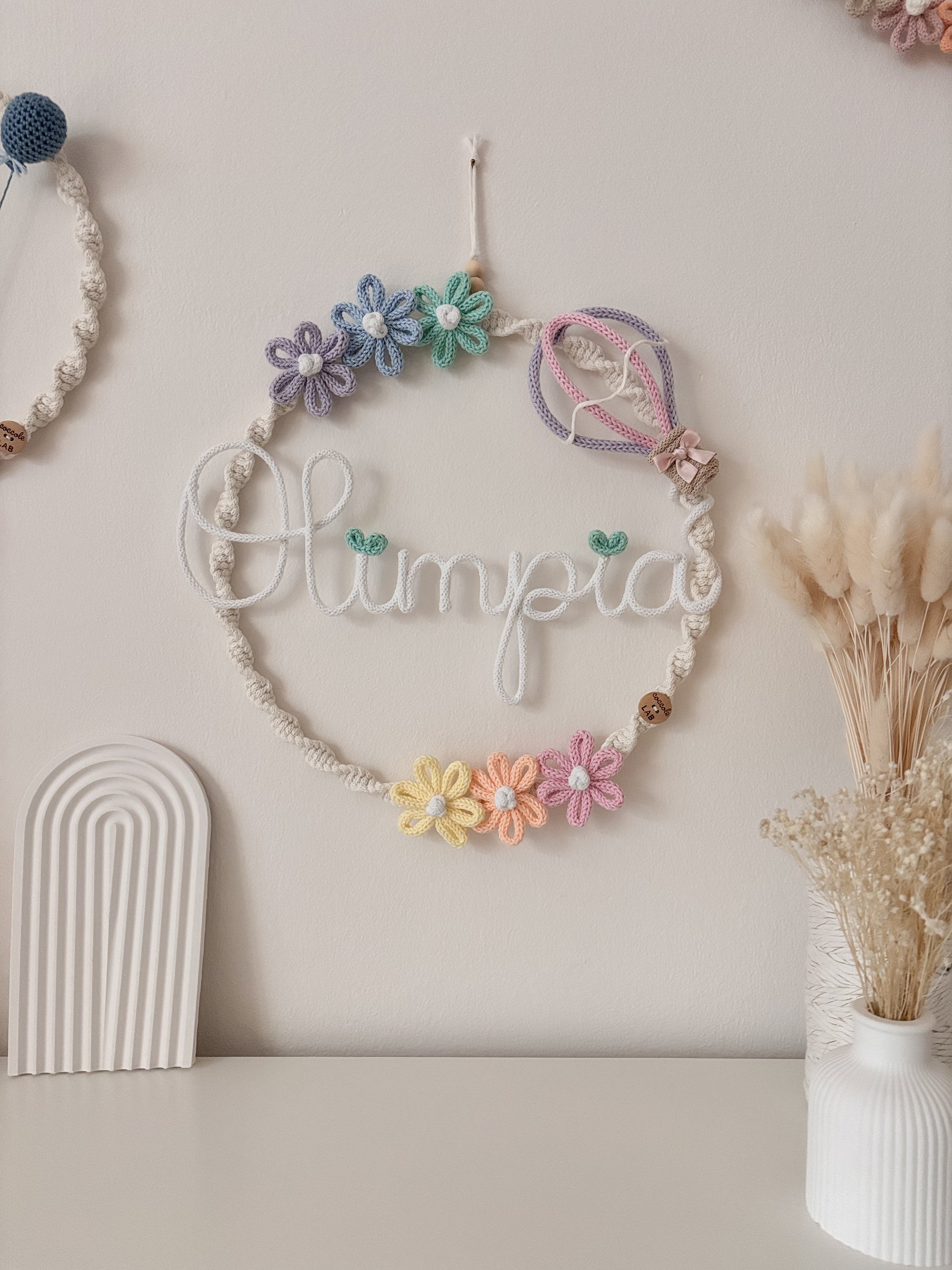 La ghirlanda nascita Fiori & Mongolfiera è realizzata a mano con cotone riciclato al 100% e certificato OEKO-TEX standard 100.