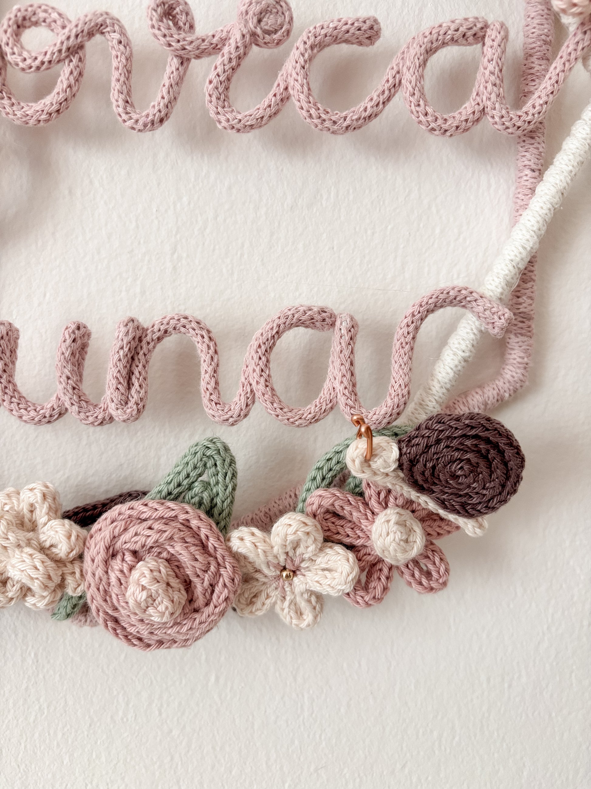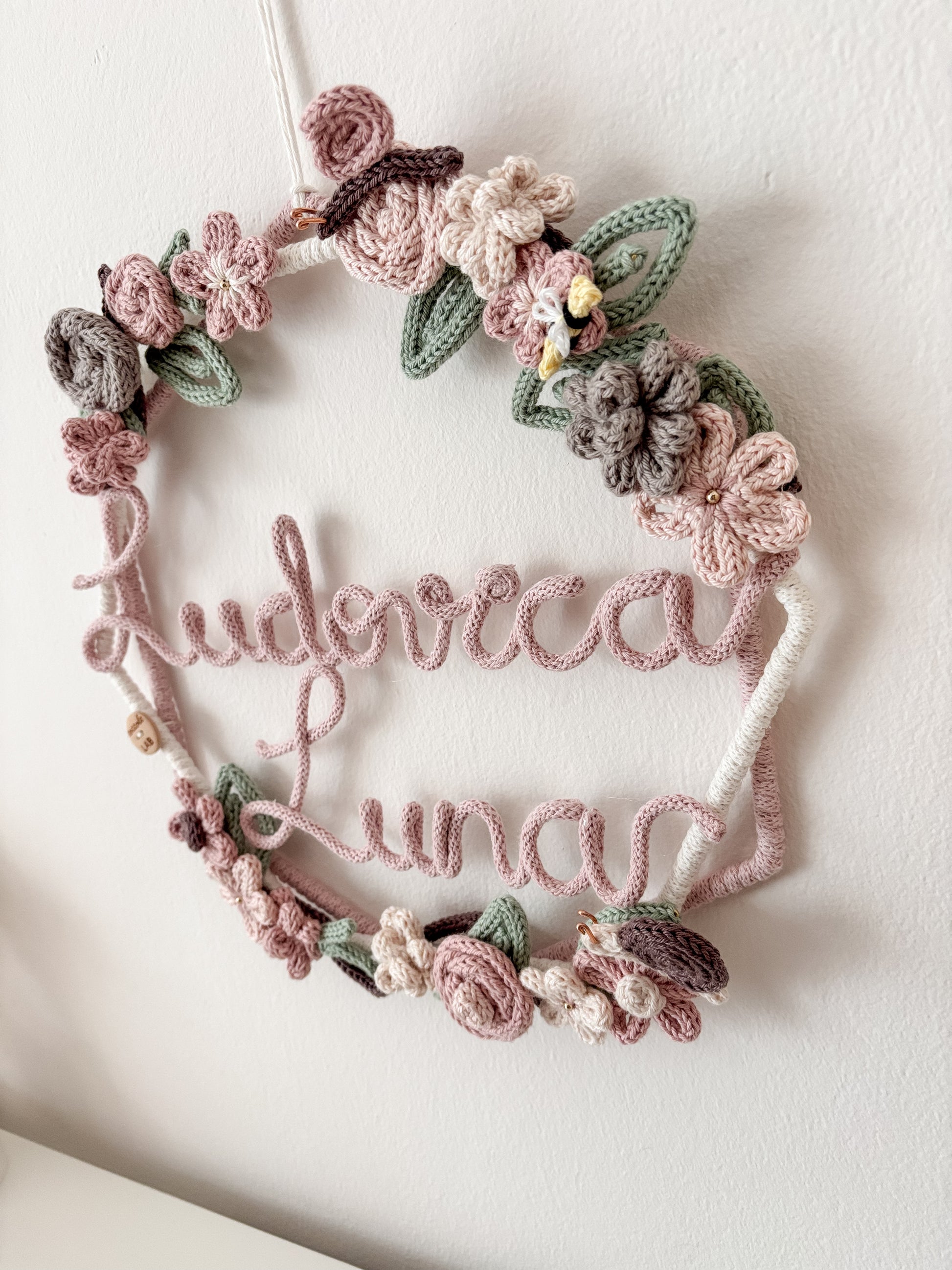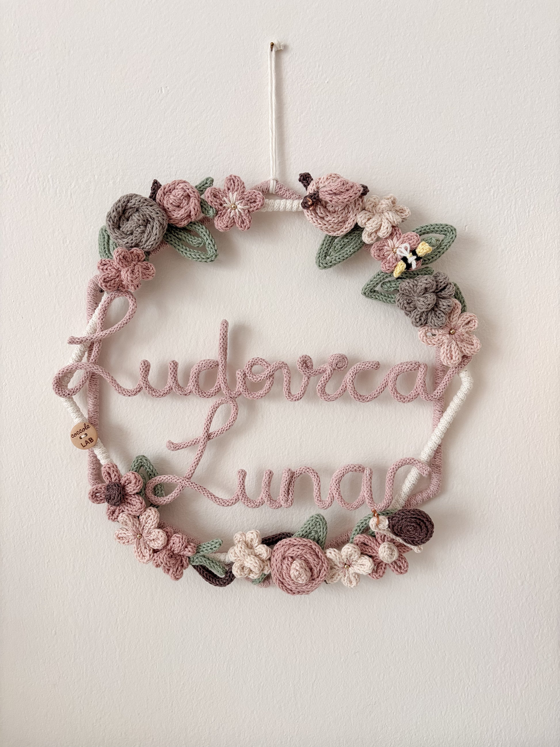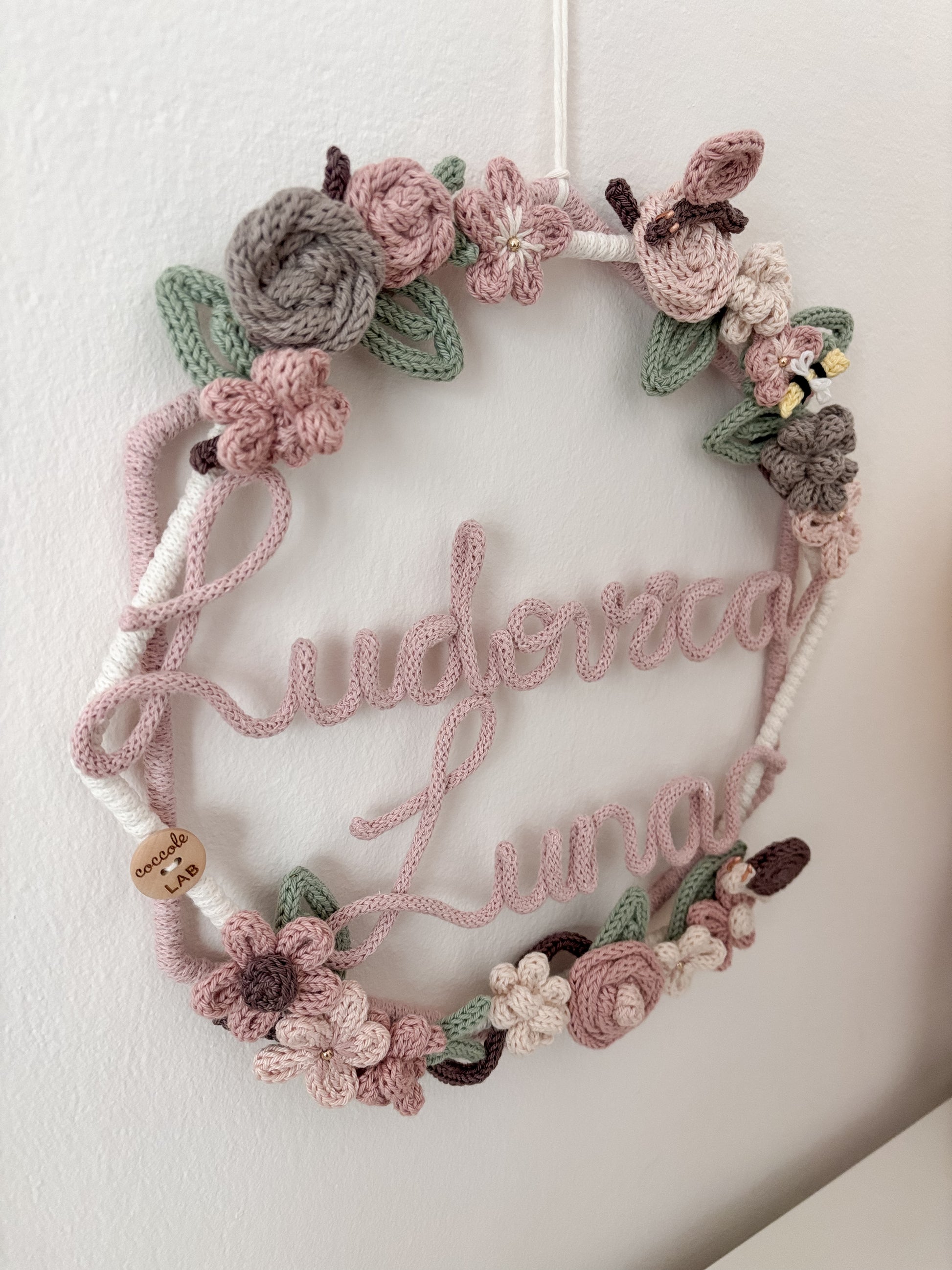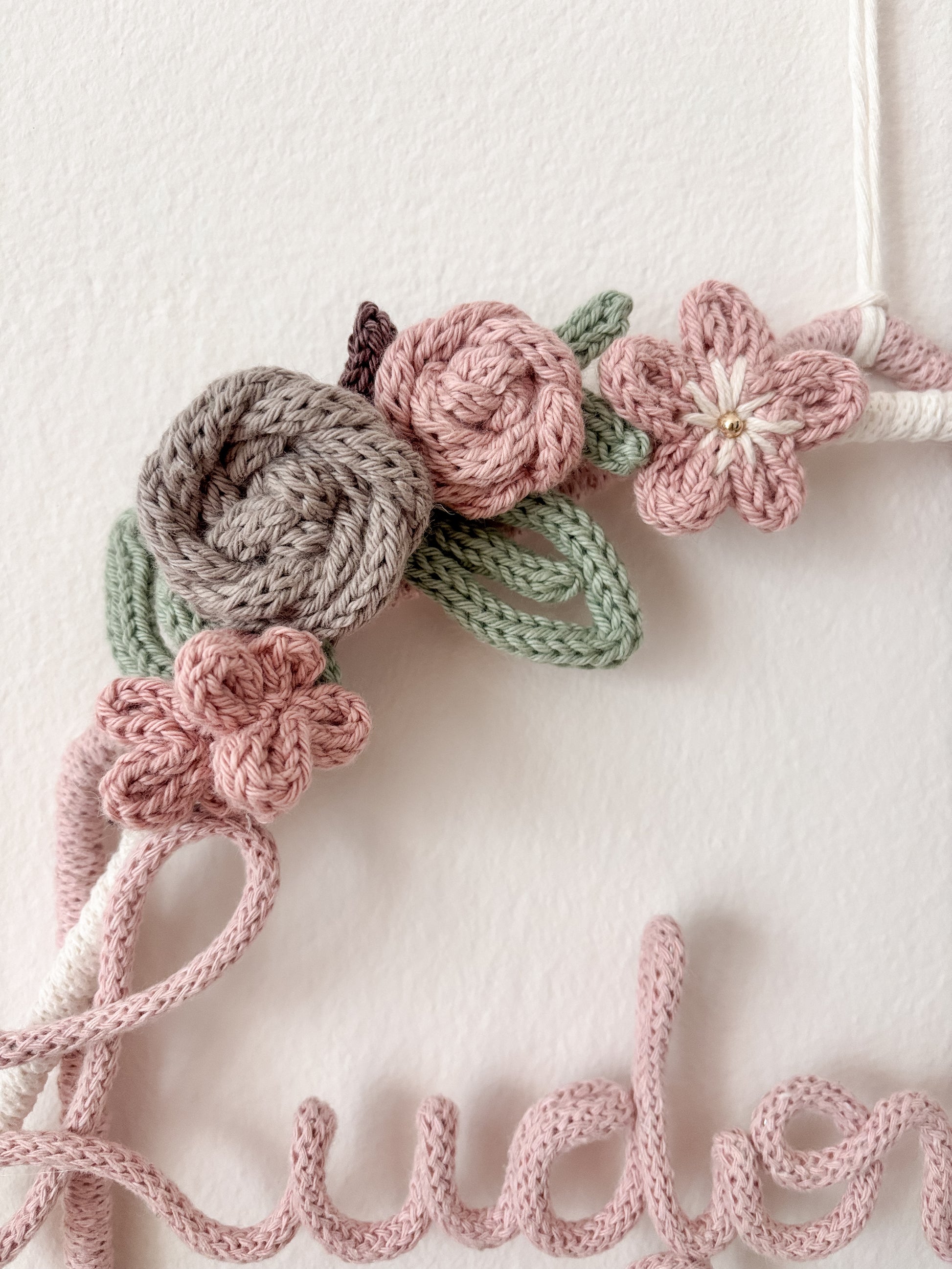 Ghirlanda nascita realizzata a mano con cotone riciclato al 100% e certificato OEKO-TEX standard 100.