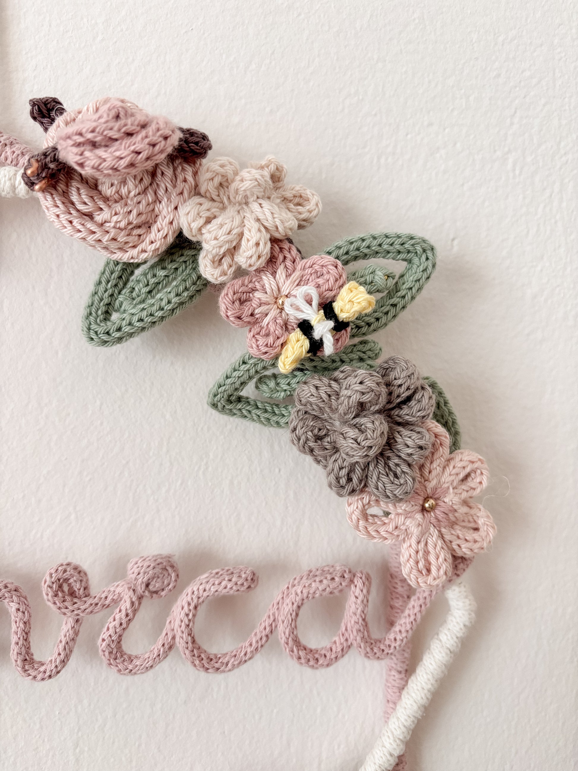 Il fiocco nascita Primavera è composto da due esagoni incrociati rivestiti in macramè, un tripudio di fiori e piccoli animaletti (api e lumachine), dalle tonalità tenui e delicate.