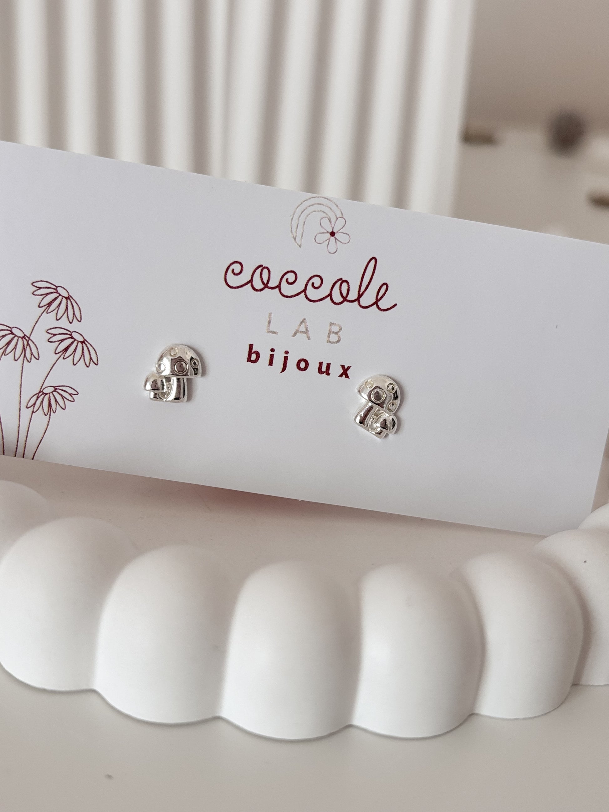 Orecchini a lobo a forma di funghetti in argento925. Ogni orecchino ha una coppia di funghi (uno grande e uno piccolo).