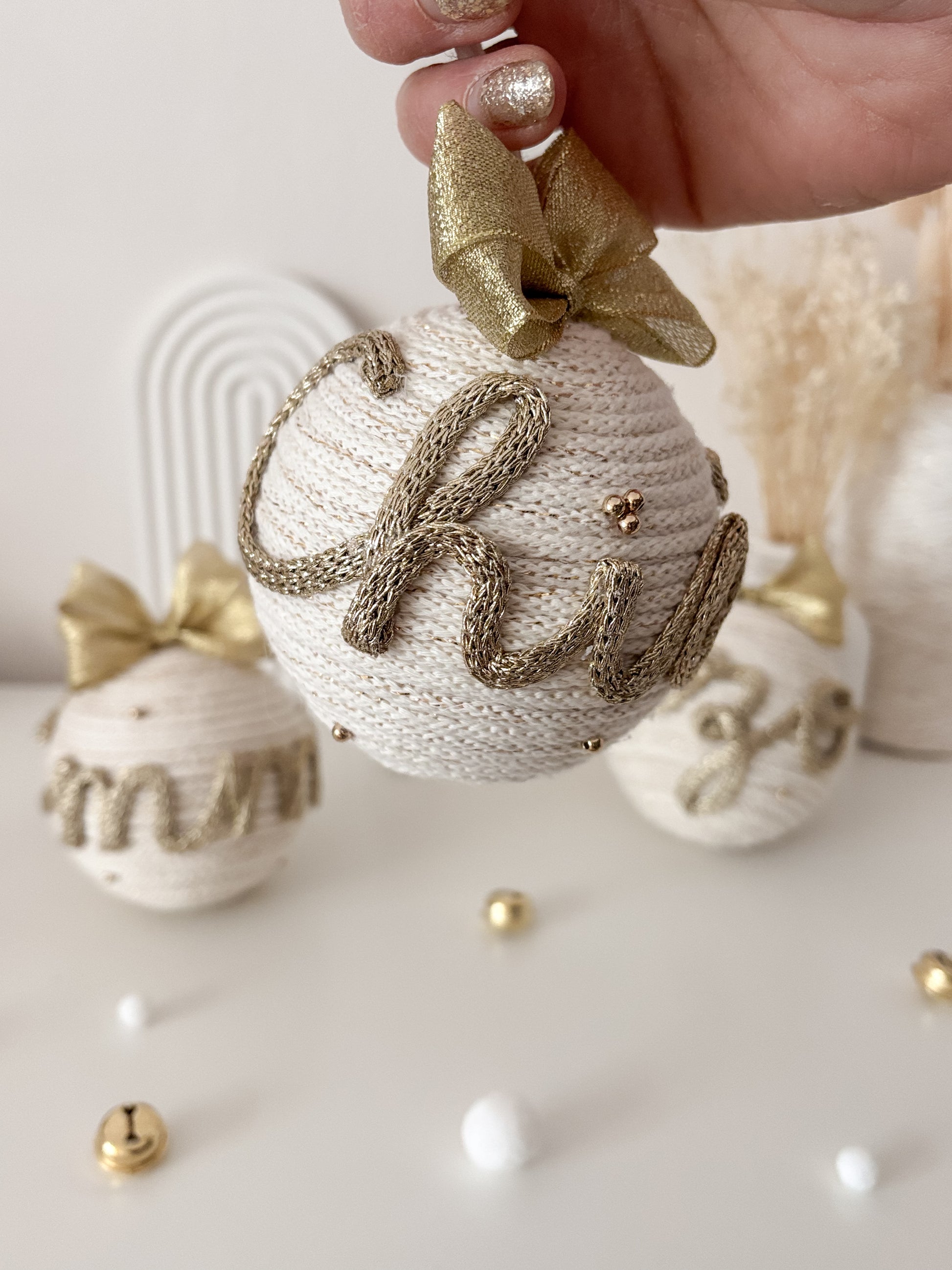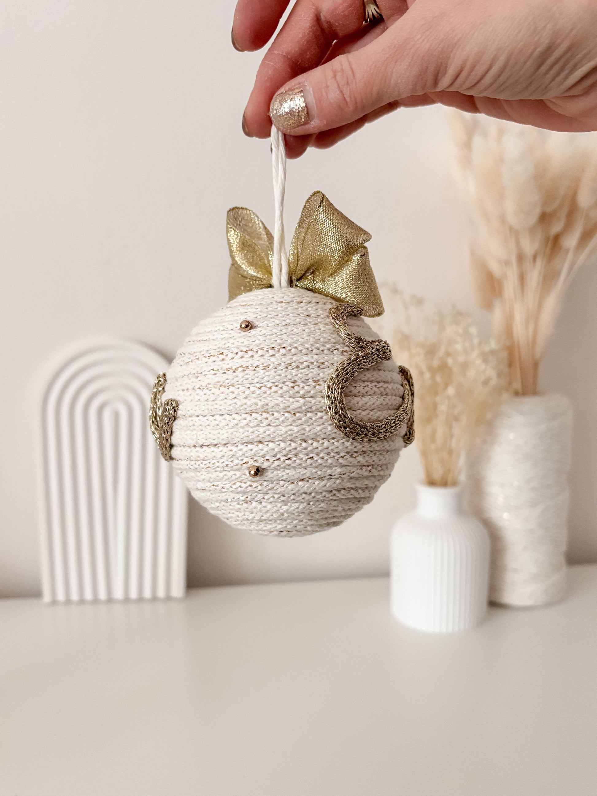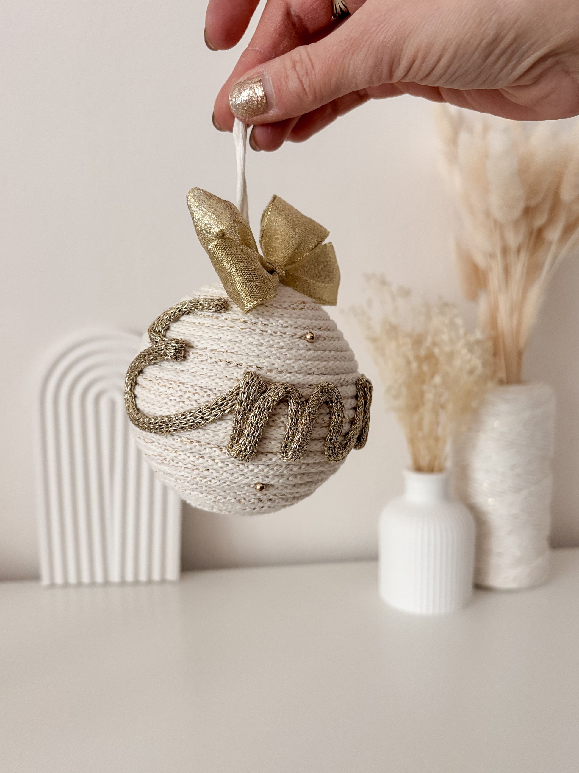 La pallina è in polistirolo rivestita con cotone color golden natural, riciclato al 100% 🌿, nome in oro e fiocco dorato.