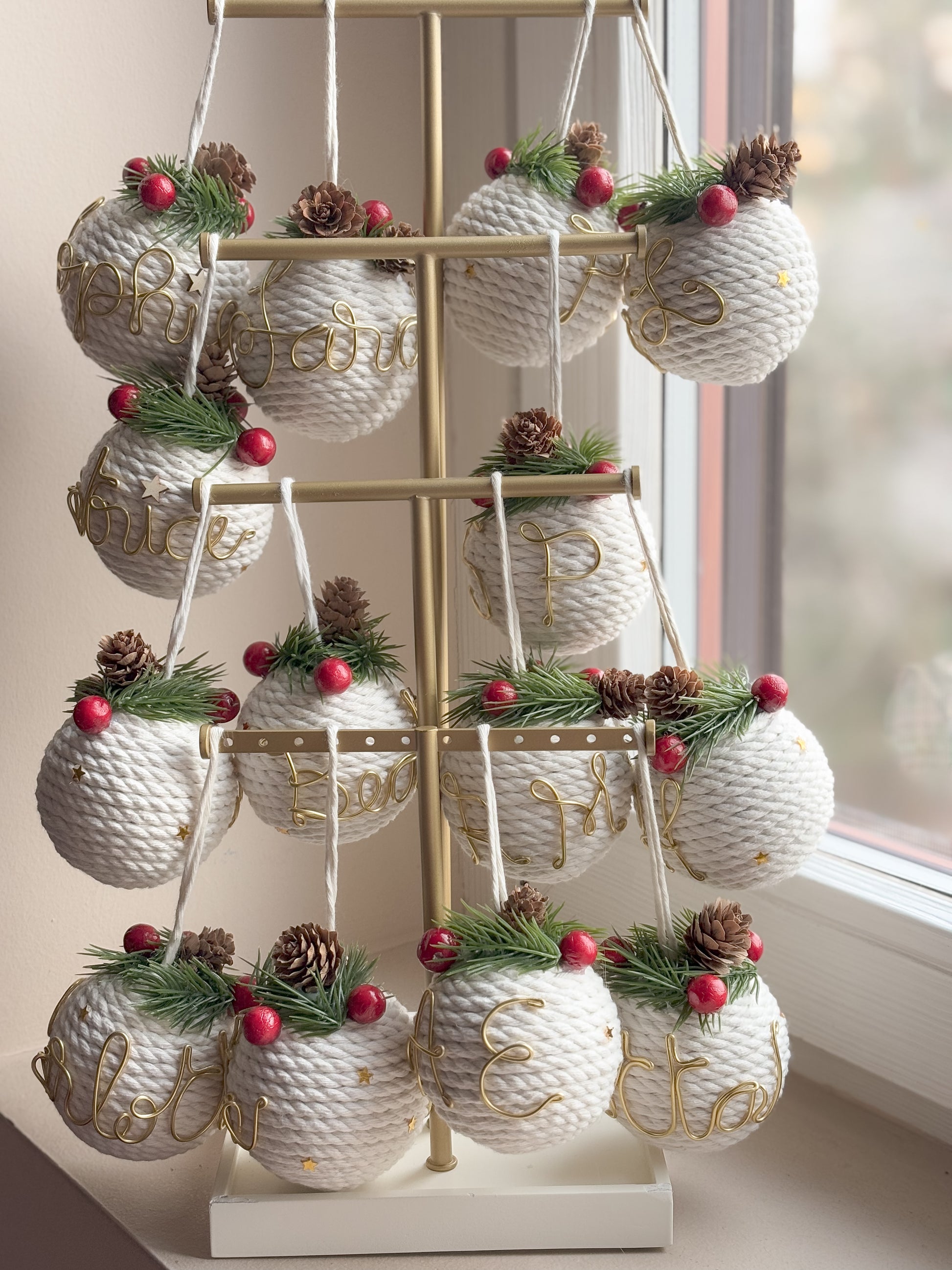 La pallina è in polistirolo rivestita con cotone ritorto color natural, riciclato al 100% 🌿 con piccola ghirlandina composta da aghi di pino, piccole pigne e bacche rosse.