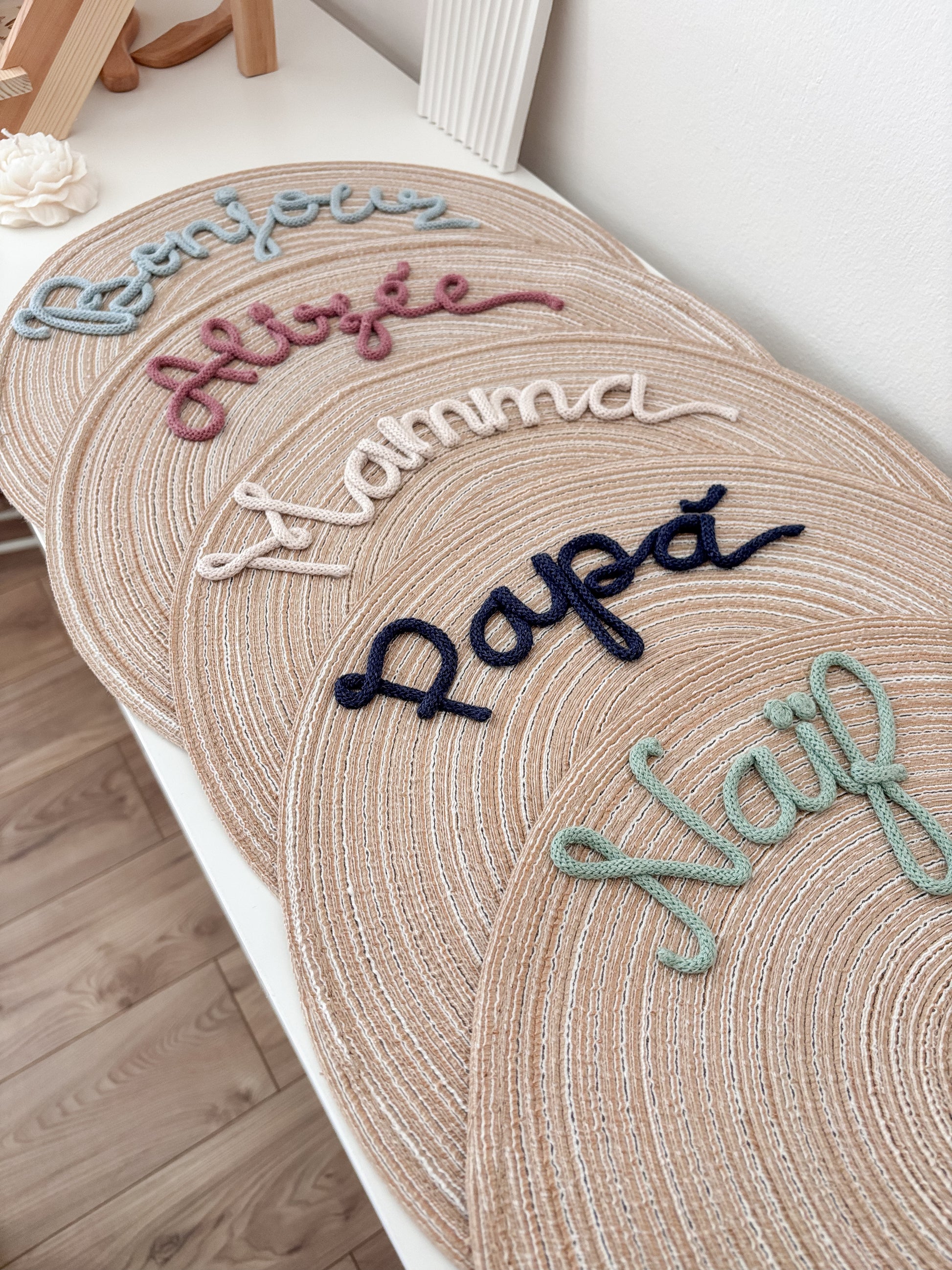 La tovaglietta ha un diametro di circa 38 cm e la scritta è realizzata a mano libera pertanto resta un prodotto unico e originale.